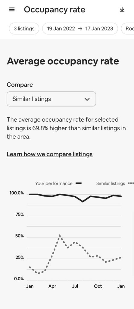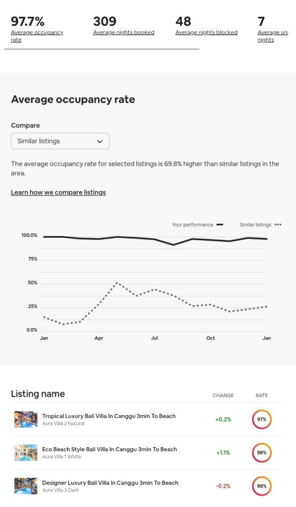 Even throughout the difficult Covid-19 pandemic, our villa management team was able to achieve high levels of occupancy for our clients. With Aura Villas, we achieved an occupancy rate of 92%, compared with the average for all Airbnb listings of just 44%.