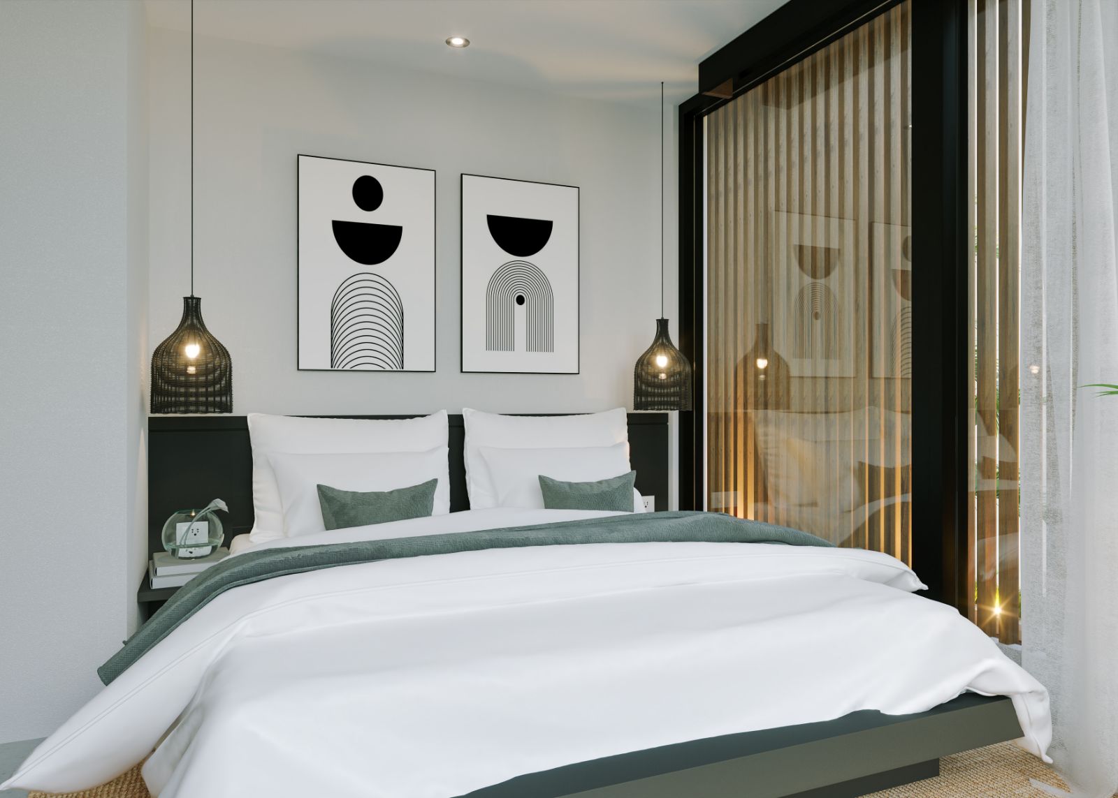 The exterior, adorned with locally sourced Paras Kerobokan stone, seamlessly integrates with the environment. Complemented with a sleek design, monochromatic color scheme, and floor-to-ceiling glass facade, everything merges the indoor and outdoor spaces.