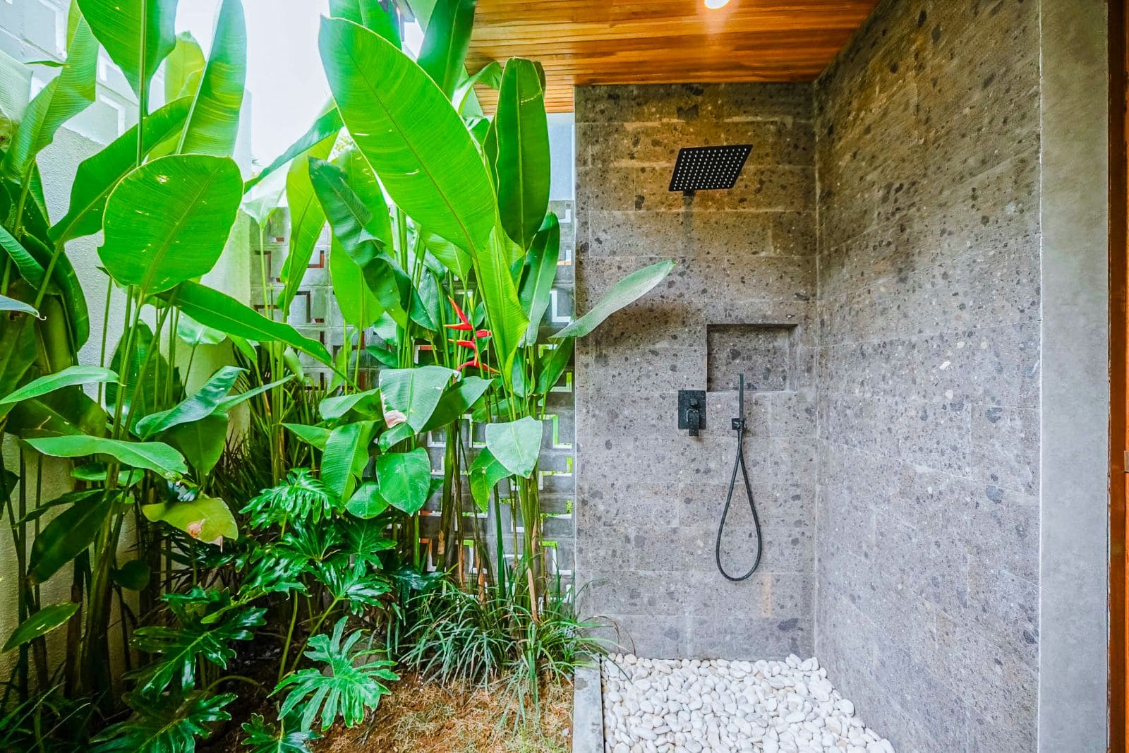 The exterior, adorned with locally sourced Paras Kerobokan stone, seamlessly integrates with the environment. Complemented with a sleek design, monochromatic color scheme, and floor-to-ceiling glass facade, everything merges the indoor and outdoor spaces.