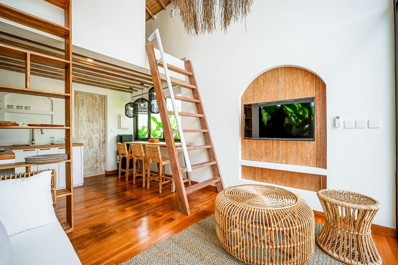 Coming fully equipped within a compact space, The Hitam features two bedrooms, an upper-level lounge, and an open-plan lower level comprising a spacious living area and a kitchen. Notable features include a semi-outdoor bathroom and black metal elements. The outdoor spaces offer tropical landscaping, a terrazzo pool, and areas for entertainment.