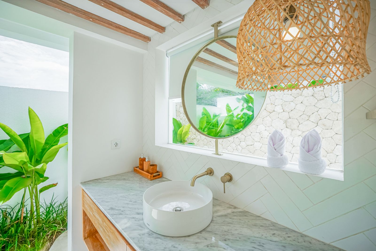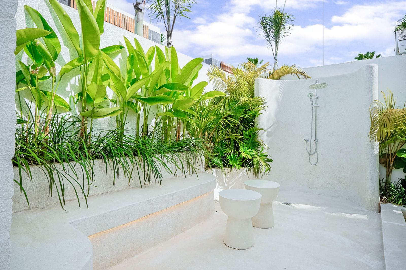 The exterior, adorned with locally sourced Paras Kerobokan stone, seamlessly integrates with the environment. Complemented with a sleek design, monochromatic color scheme, and floor-to-ceiling glass facade, everything merges the indoor and outdoor spaces.