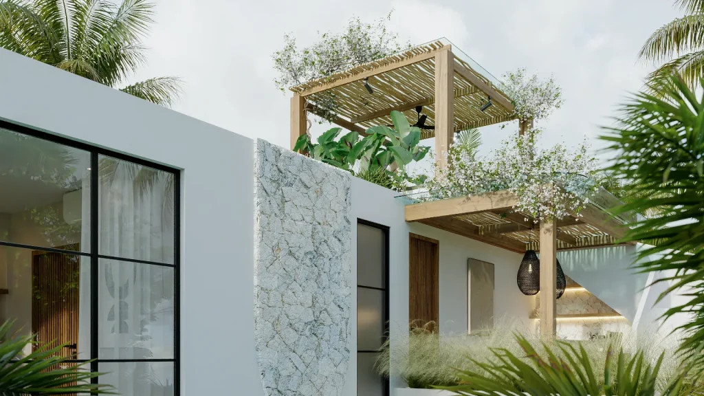Another highlight is undoubtedly the rooftop area, with a beautiful wooden pergola and bench, providing the perfect spot to enjoy the stunning views of Uluwatu’s hill and ocean.